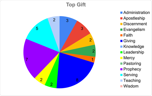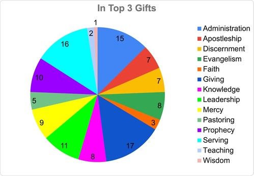 The 2 pie charts show how these gifts are distributed in our congregation. The Top Gift chart shows how many people have which of the 14 spiritual gifts as their top gift. The In Top 3 Gifts chart shows how many people have one of the 14 gifts in their top 3.